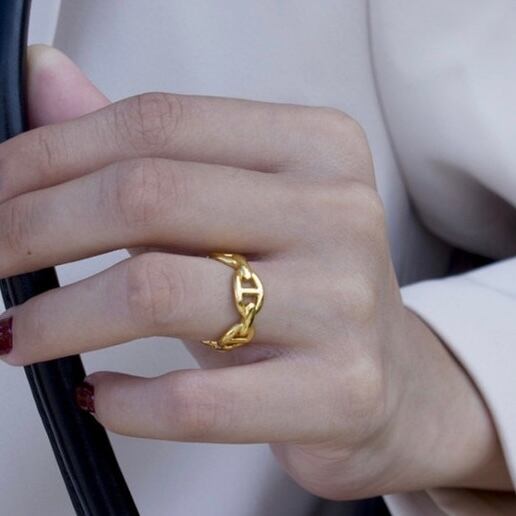 美しい曲線で描かれたチェーンのようなデザインがポイントのリングです。