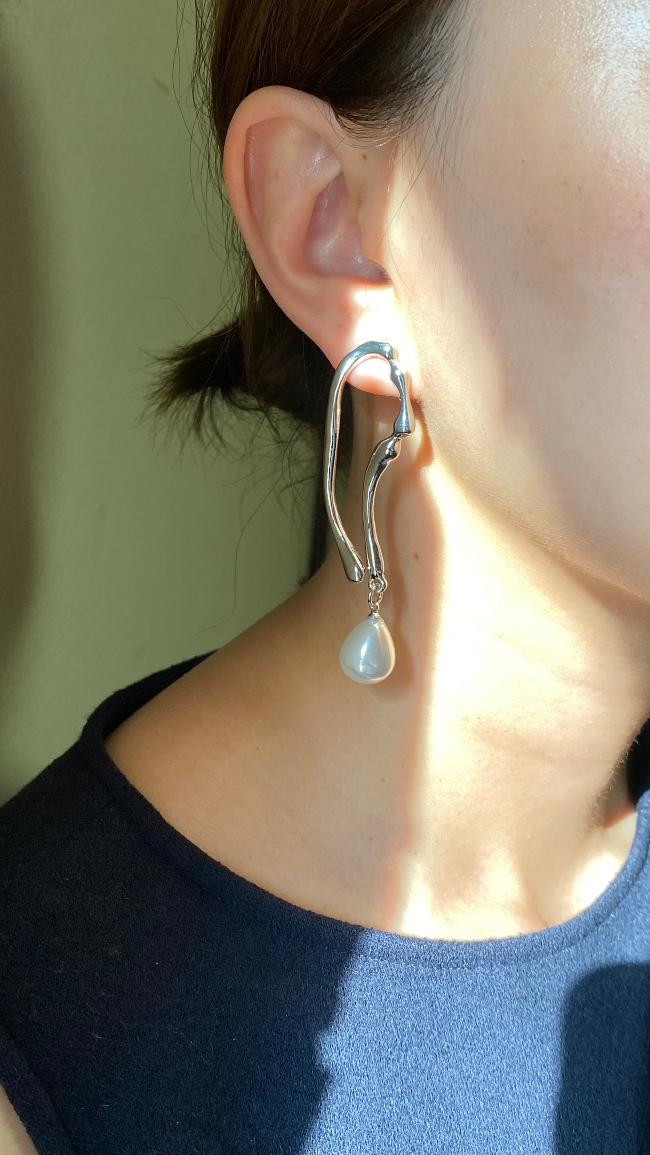 少し歪な楕円リングに涙型のフェイクパールがついたピアス。